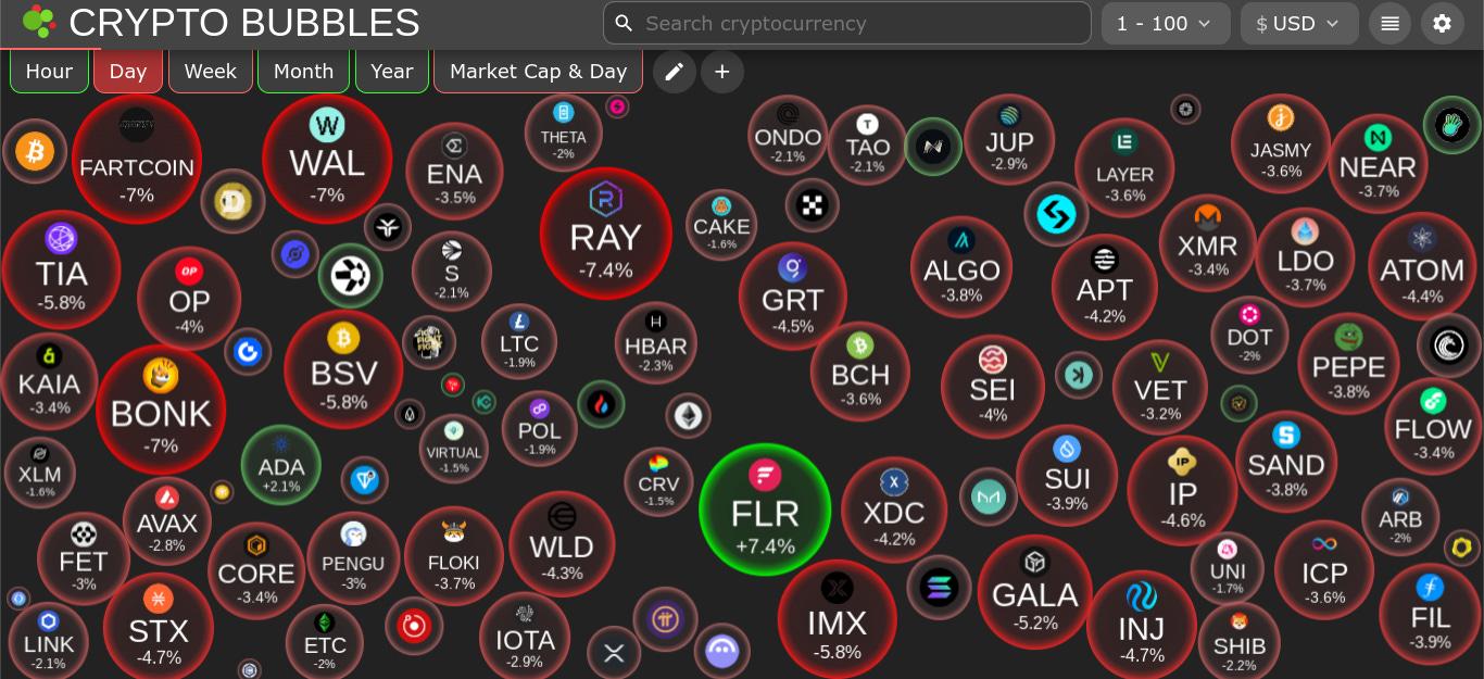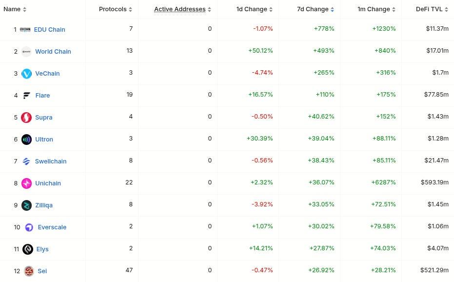 Chains are mixed today. Top 50 chains up at least 20% on the weekly include Unichain (#15), and Sei (#17).