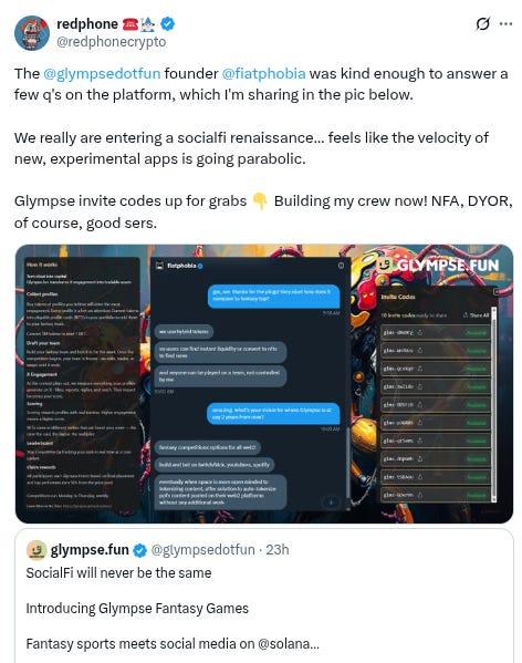 -Something new called @glympsedotfun. Twitter bio states “Bet on influence”. Followed by 17 of our mutuals. h/t @redphonecrypto: