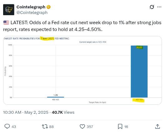 -Markets are currently pricing in a 99% chance the Federal Reserve will not lower interest rates next week, h/t @Cointelegraph:
