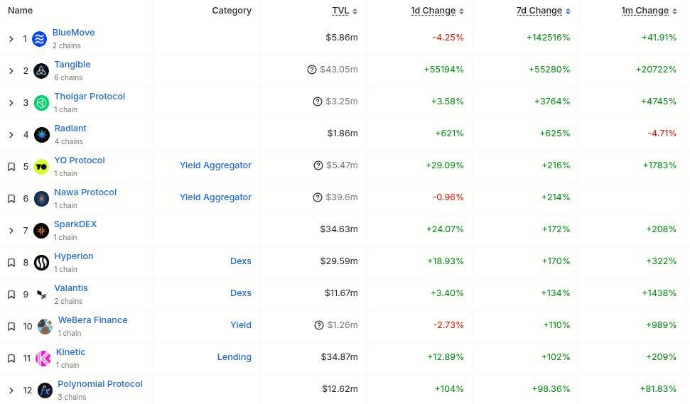 Here’s The Top 12 Best-Performing Chains By TVL On The Weekly With At Least $1M TVL (from @DefiLlama):