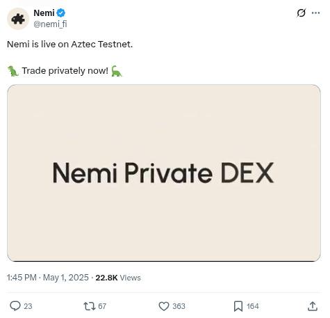 -Something new called @nemi_fi. Twitter bio states “Private DeFi on @aztecnetwork testnet.” Followed by 7 of our mutuals. h/t @AresLabs_xyz: