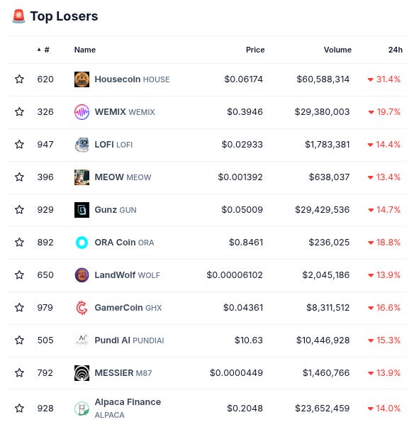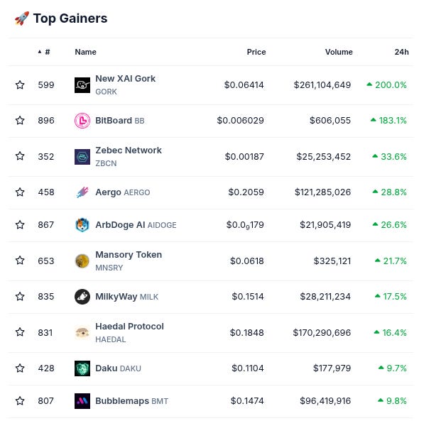 Protocols are mixed today as well. Top 100 protocols up at least 20% on the weekly include Zircuit Staking (#20), and Yei Finance (#93).