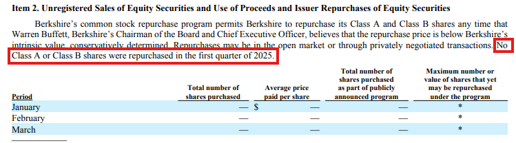 Not only did Berkshire Hathaway build a record cash balance, they also repurchased $0 of stock in Q1 2025.