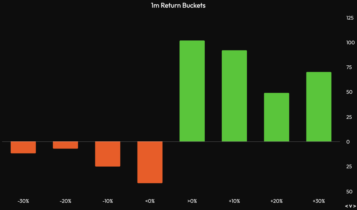 Regardless of the overall bounce in the crypto market last month, you can see how divided the returns have been. There's a decent chunk of the market which has still been flat or down over the past 30 days. Then out of the green coins there's a huge discrepancy. Some coins are