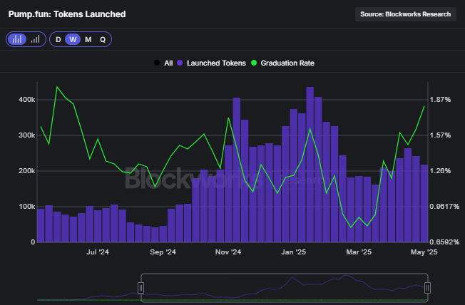 2/ At the top, Pumpfun dominates the launchpad market with over 200k launched tokens per week and a graduation rate climbing towards 2%.