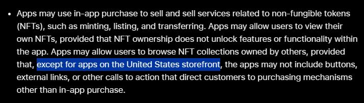US apps are no longer barred from adding external links, buttons, or other ways to get users to leave the app to “browse NFT collections owned by others.”