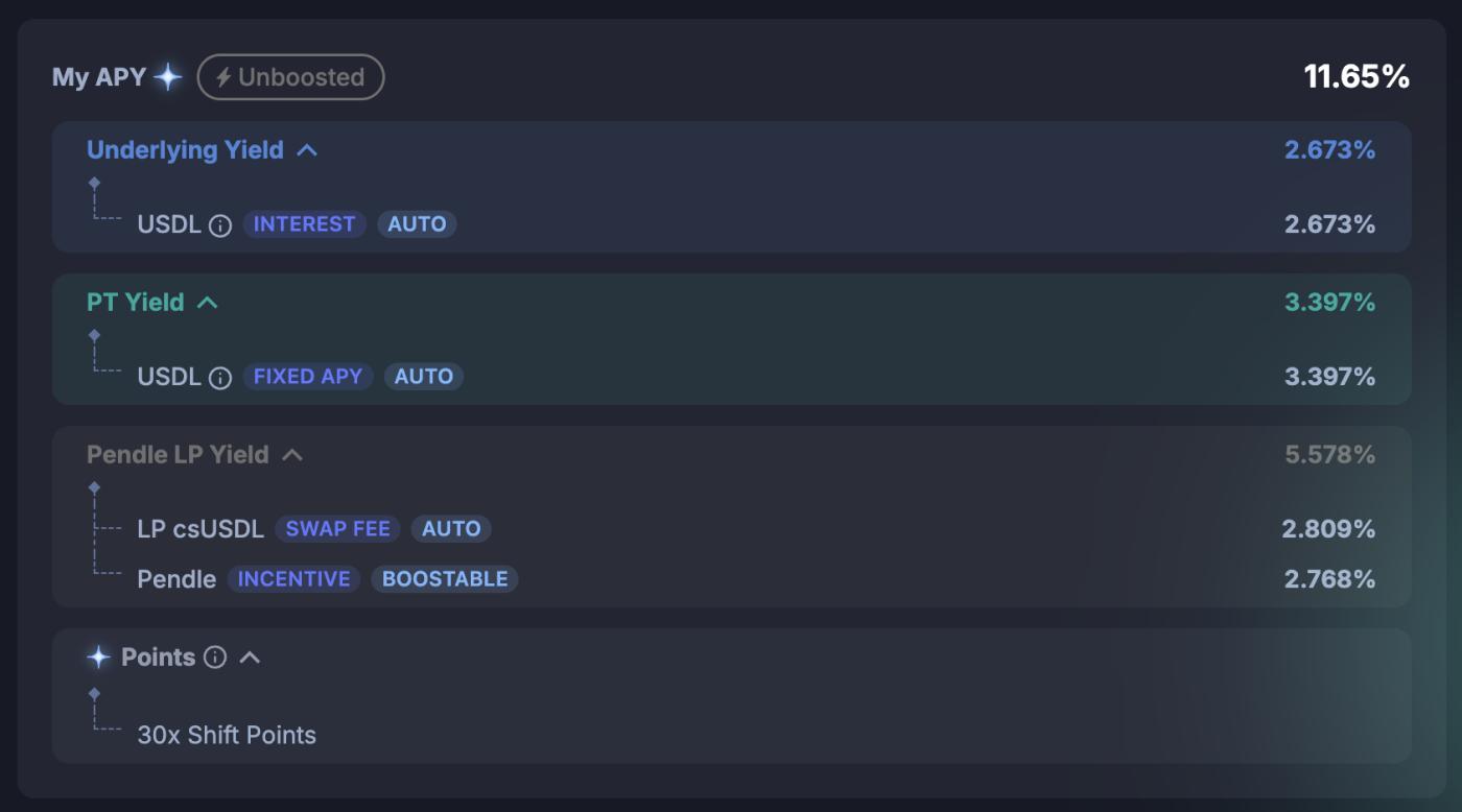 Currently, users can directly purchase PTs expiring on July 31 on Pendle, with an APY of 11.5%; LP market-making APY is 11.65% (can increase to 17.76% with sufficient PENDLE staking), while also earning 30x Shift points.