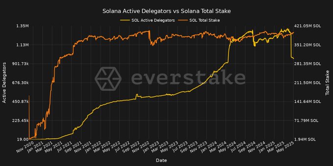 🟡 Delegators jumped 4× in Q1-Q2 ’24 to >1M, while 🟠 total stake held a 280-420M SOL range since ’21. Same pie, more eaters ➜ wider stake distribution & a sturdier Solana network 👀 $SOL #Solana #staking #everstakedata