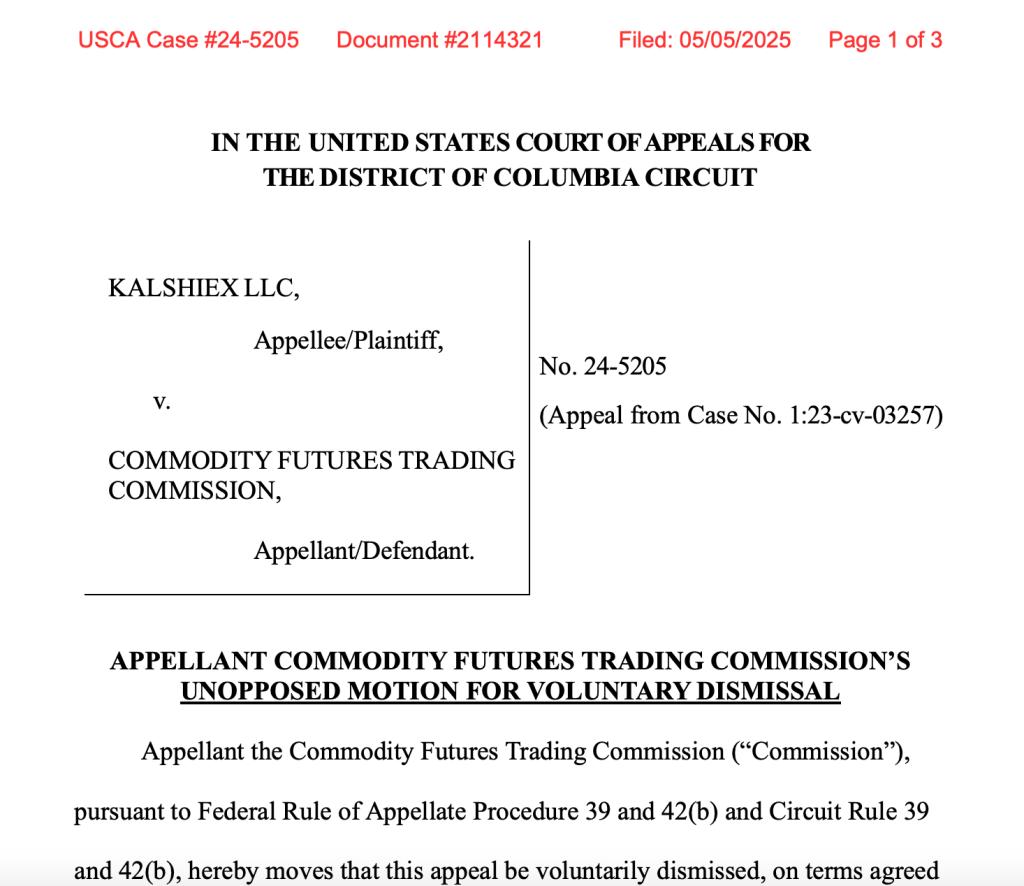 On May 5th, the Commodity Futures Trading Commission (CFTC) unexpectedly filed a motion with the District of Columbia Court of Appeals to withdraw its appeal against the Kalshi prediction market platform, marking a legal turning point that could set a precedent for political event contracts in the US - especially contracts related to presidential election results.