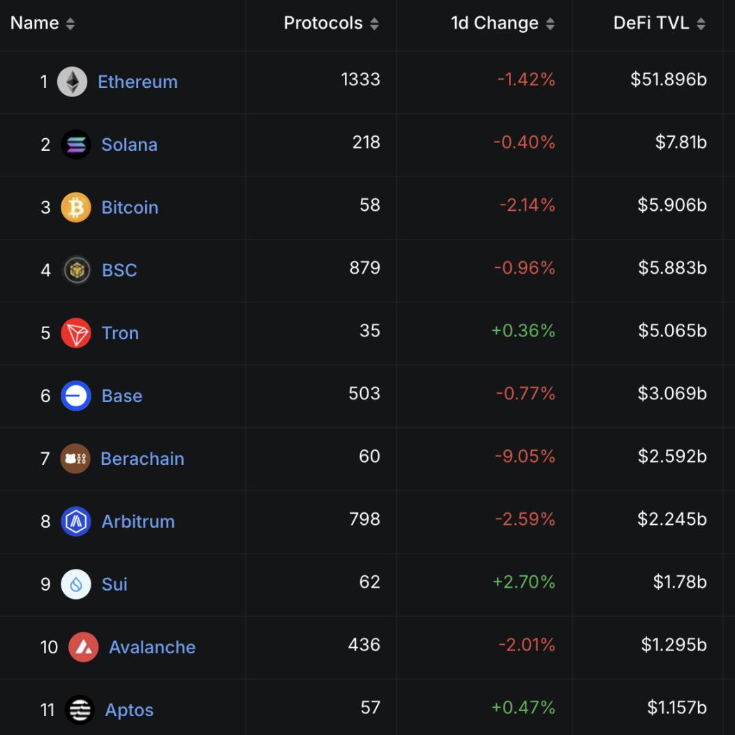 Public chain DeFi TVL ranking, data: DeFiLlama