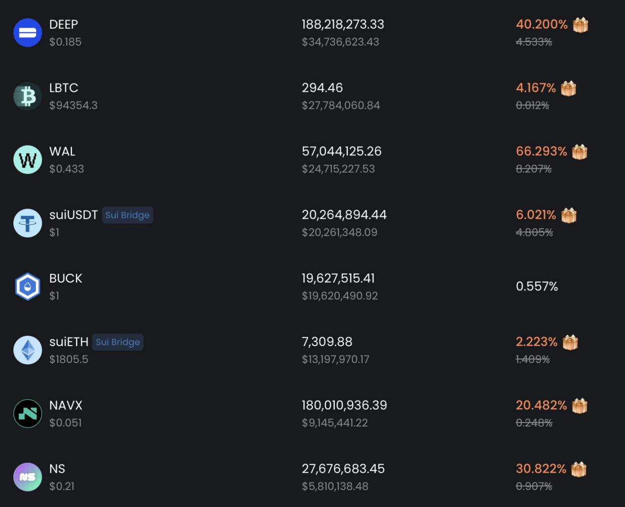 Interestingly, except for the SUI native currency, the above airdropped ecological tokens have not been listed on Binance (no chips have been handed over), and the initial circulation volume is relatively low. In the DeFi protocol of the Sui ecosystem, these tokens are provided with extremely high deposit rates, further locking the tokens and reducing circulation.