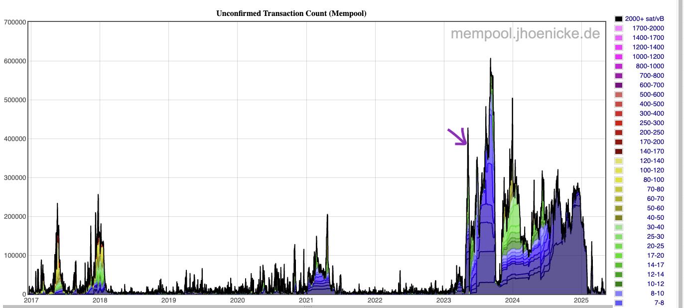 At the time, 425,000 transactions were sitting in the Bitcoin mempool, as represented by Jochen Hoenicke’s full node, breaking the previous record of almost 262,000 from peak bull market in December 2017.