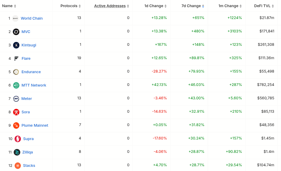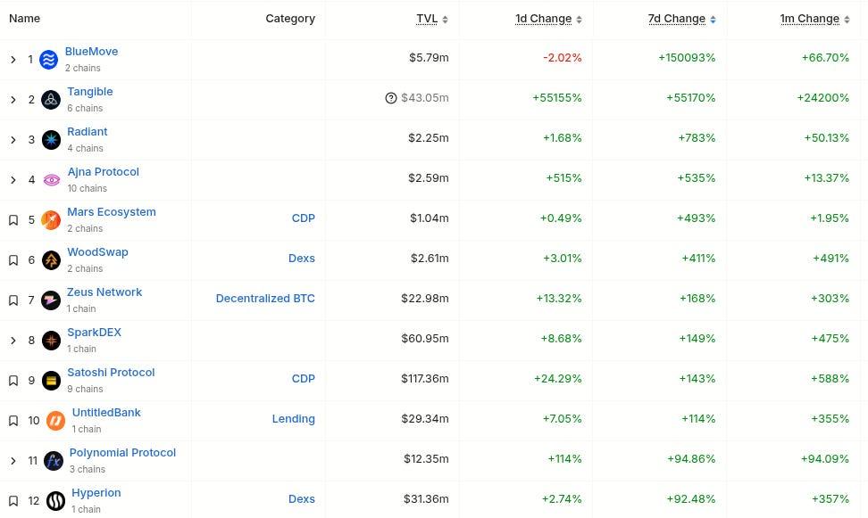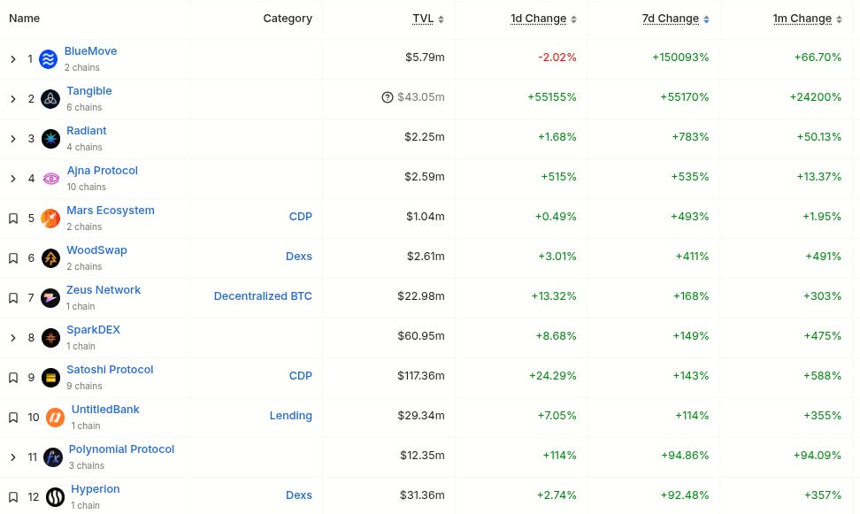 Here’s The Top 12 Best-Performing Chains By TVL On The Weekly With At Least $1M TVL (from @DefiLlama):