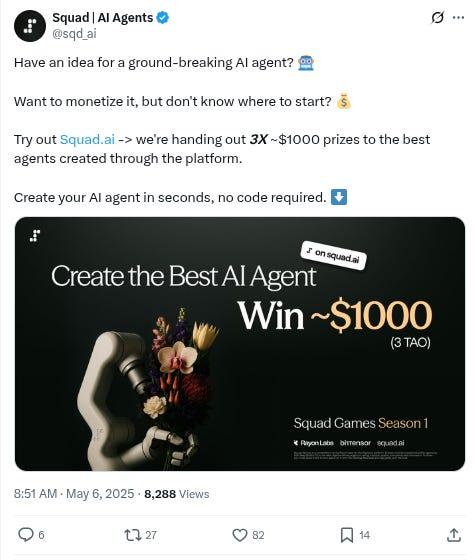 -New project called @sqd_ai. Twitter bio states “No-Code End-to-end AI Agents for Everyone. Powered by @chutes_ai , built by @rayon_labs The future of AI agents starts now.” Followed by 5 of our mutuals. h/t @AresLabs_xyz: