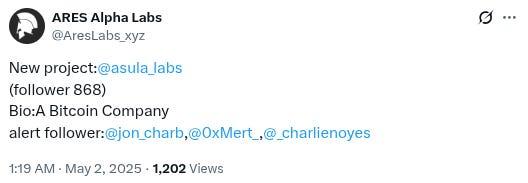 -New project called @asula_labs. Twitter bio states “A Bitcoin Company”. Followed by 37 of our mutuals. h/t @AresLabs_xyz: