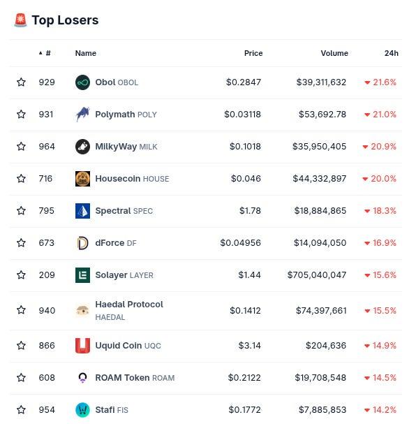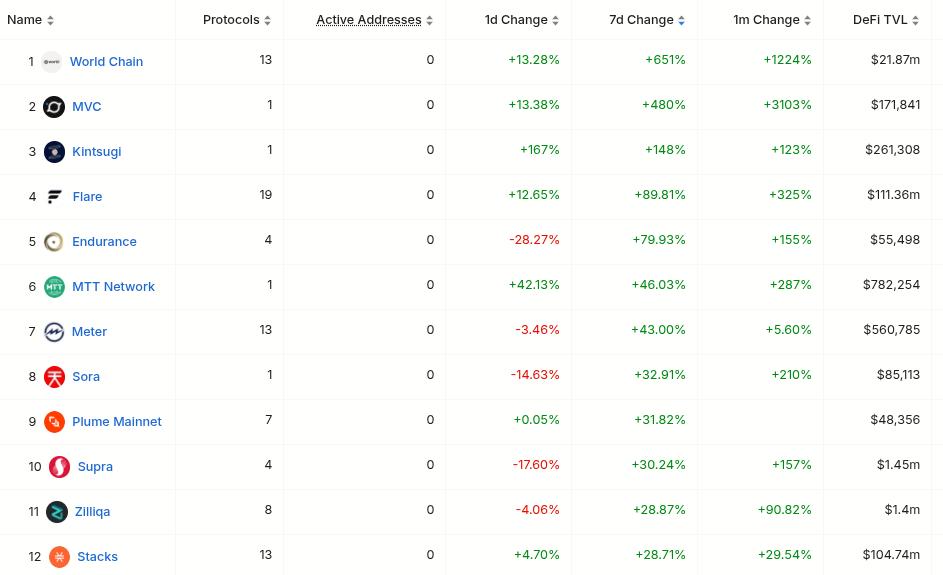 Chains are mixed today. Biggest gainer on the weekly among top 25 chains is Unichain (#15) at +28.54%, and biggest loser is Sei (#17) at -14.67%.