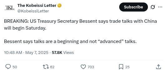 -Administration is apparently going to start trade negotiations with China, h/t @KobeissiLetter: