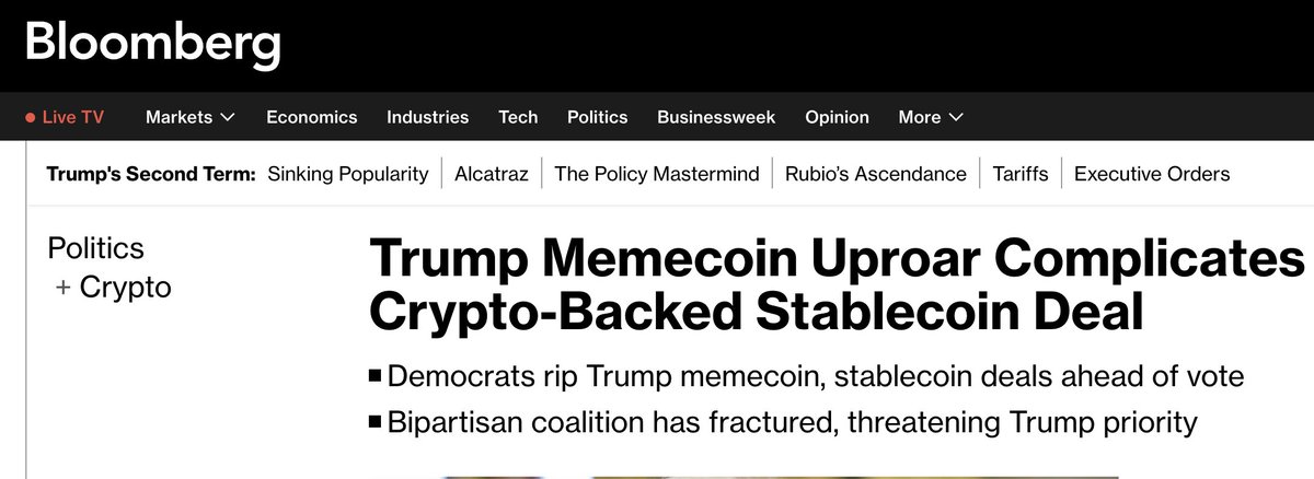 "The controversy over President Donald Trump’s crypto profits is threatening to derail a quick deal on bipartisan stablecoin legislation backed by both the crypto industry and the White House."