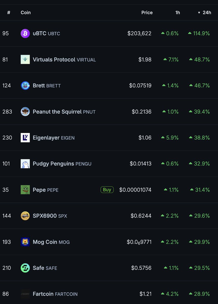 I had forgotten how a good pump feels like. $ETH is up 18% but 7/10 best performing alts are memecoins. (except for the depegged and low volume uBTC which @coingecko should delist)