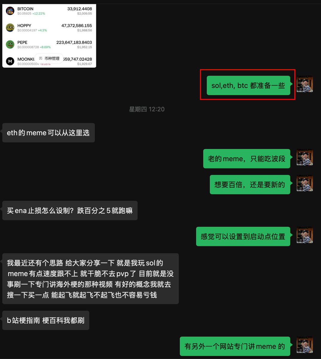 After discussion among experts in the group, everyone anticipated that a large MC memecoin would emerge on the chain during a stable secondary market, notifying group members to prepare SOL, ETH, and BTC.