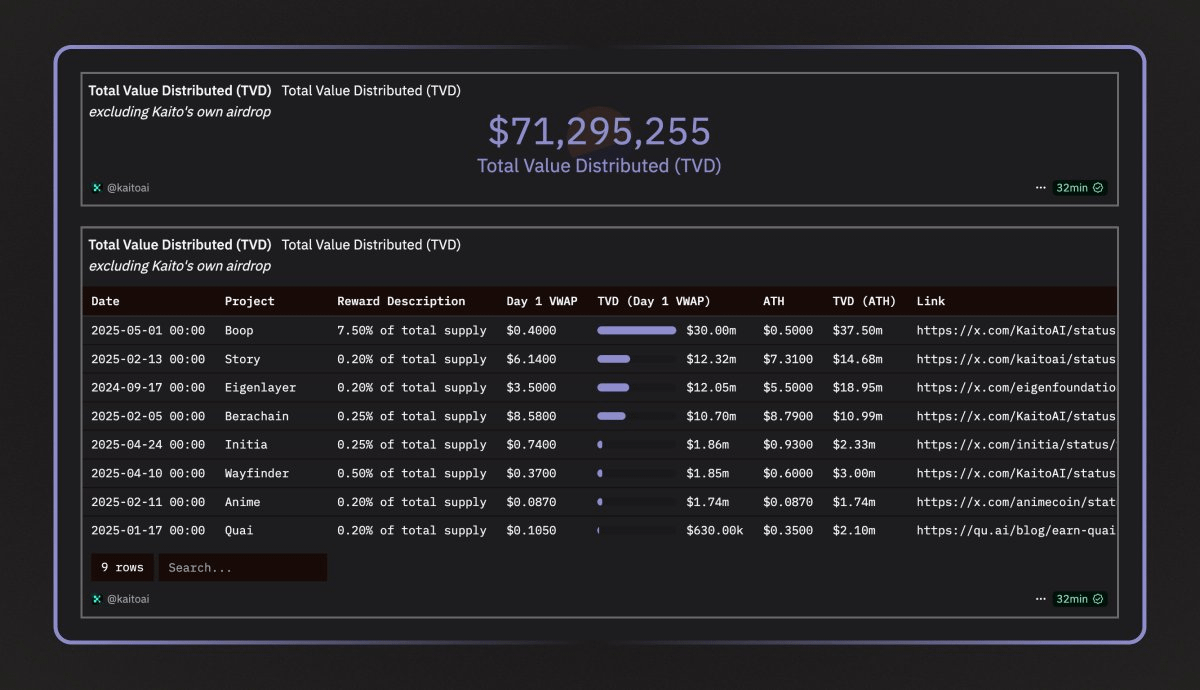 As of May 7, 2025, official statistics show that more than 71 million USD worth of rewards have been issued, excluding the $KAITO airdrop. twitter.com/84375672/status/19...