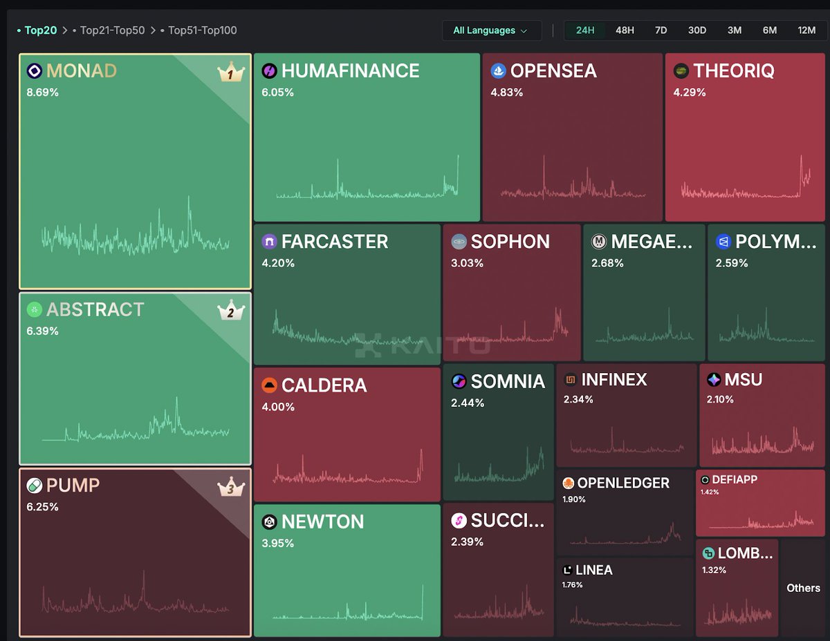 In the Pre-TGE Arena above, you can see the Mindshare rankings of the top 100 projects on Twitter that have not yet issued a token. Clicking on a project can also show the rise and fall trends in different periods (as shown below).