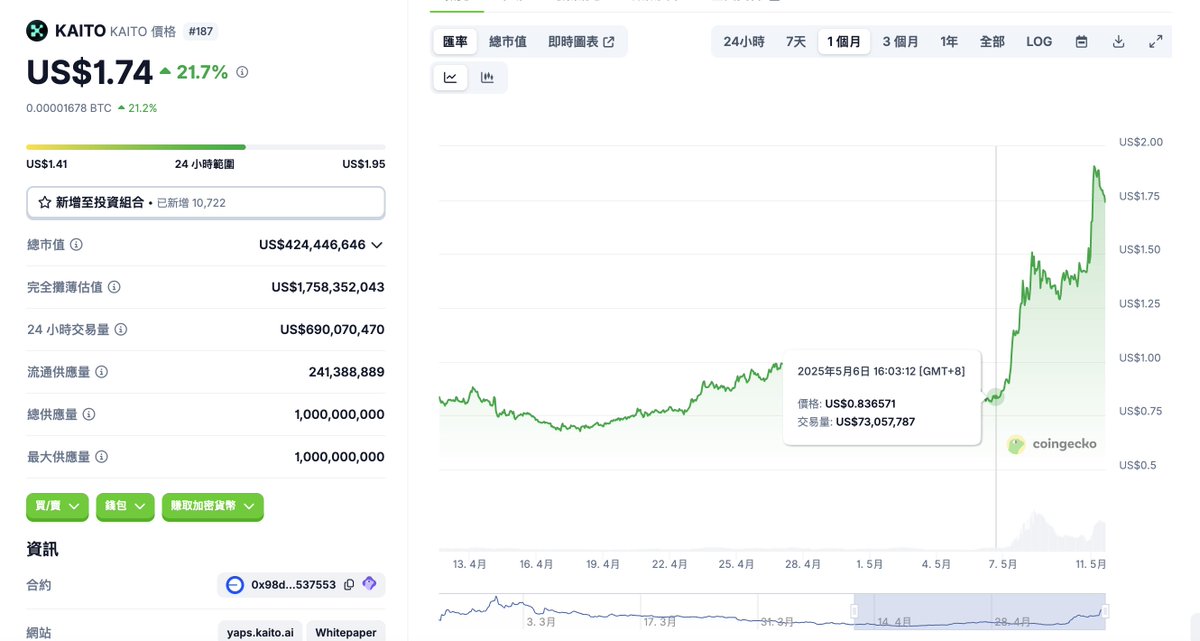 Kaito is an essential Web3 one-stop social information tool that integrates "community insights + attention economy" into a single platform. Whether you are a lurker seeking key social information or a creator looking to produce content on social platforms, Kaito can help you
