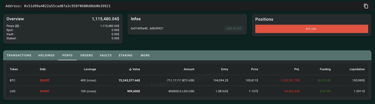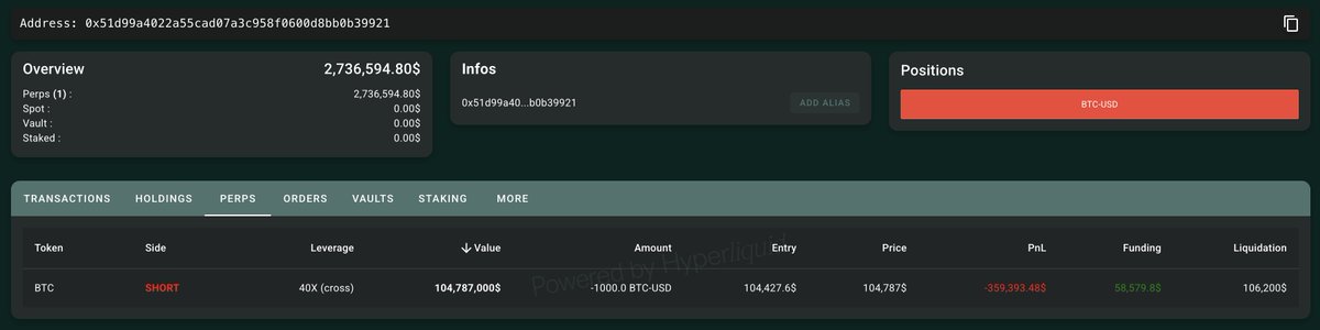 Now he has a total of 1,000 BTC short, worth $104.8 million, with an opening price of $104,427 and a liquidation price of $106,200.