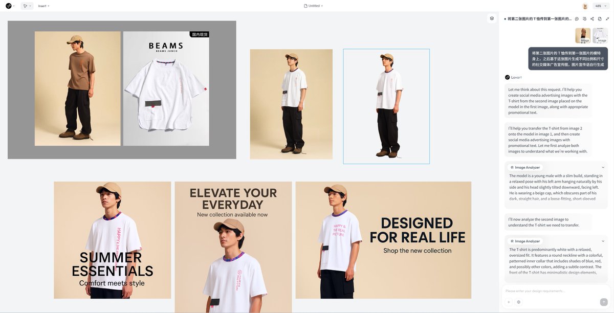 In addition to videos, Lovart AI also greatly improves the efficiency of image material production. For example, here I asked it to put the white T-shirt on the model in Figure 1, and then based on this picture, it generated the advertising pictures required by different platforms at one time. I did not intervene in the whole process. It is so powerful.