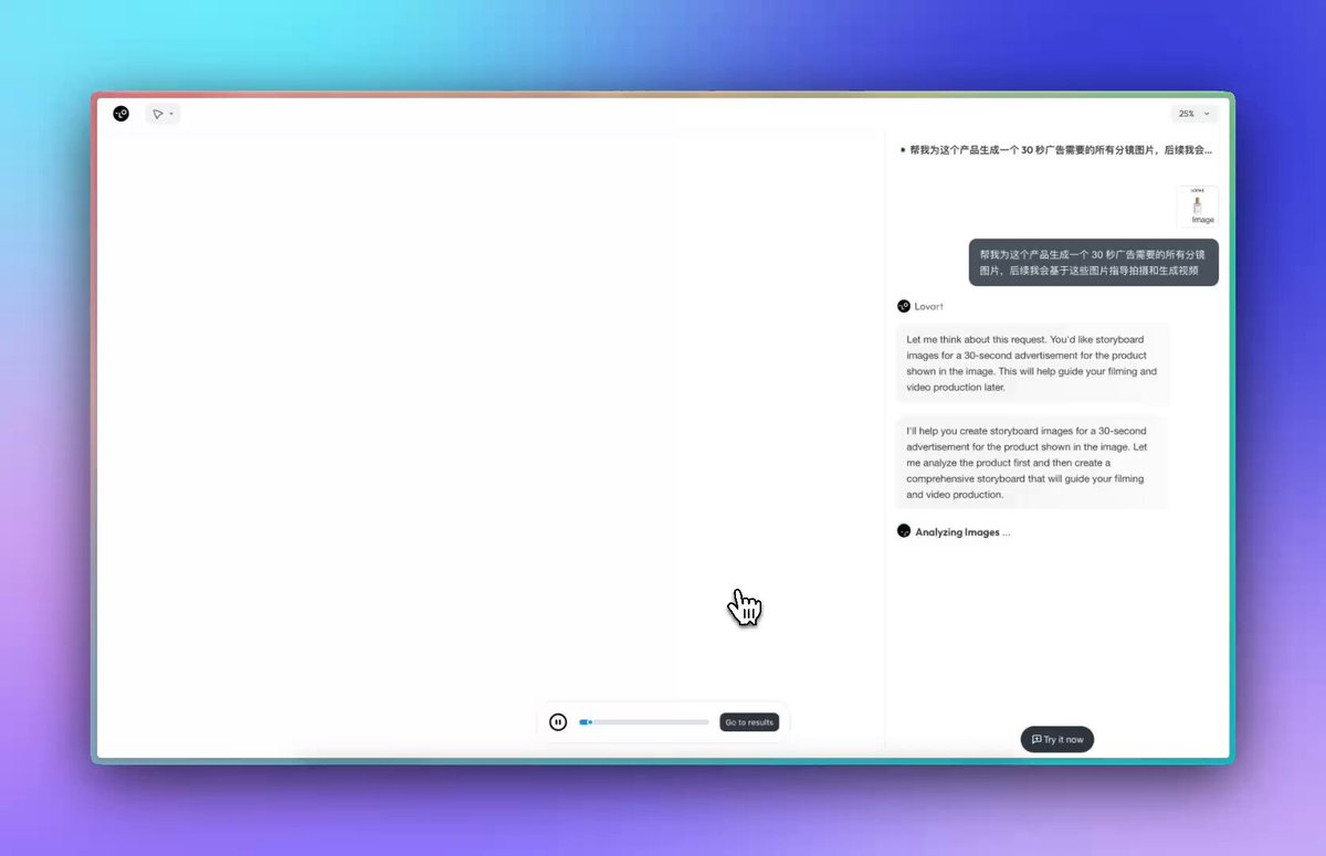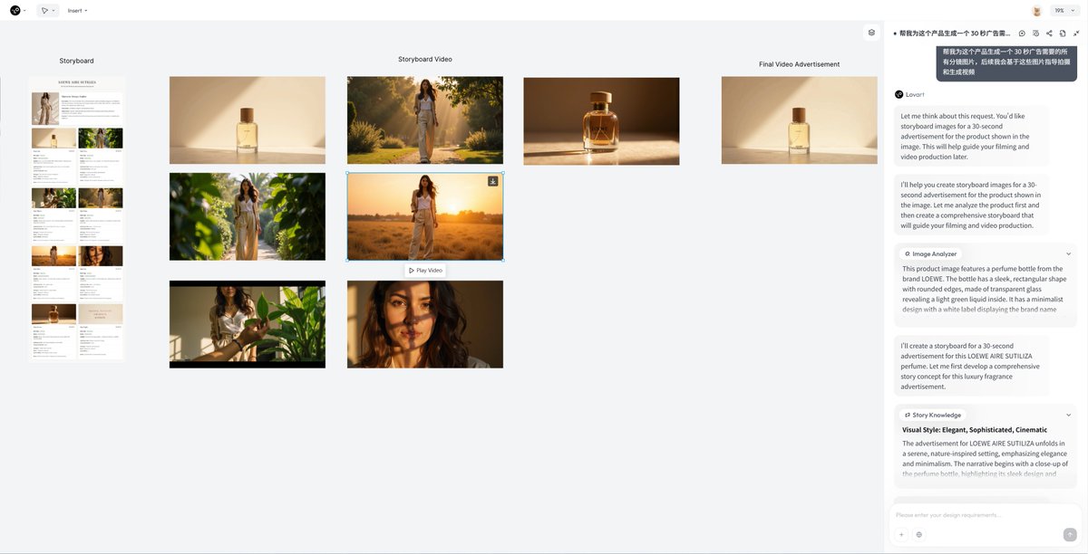 The prompt I sent was "Help me generate all the storyboards for a 30-second ad for this product. I will guide the shooting and video generation based on these pictures later."