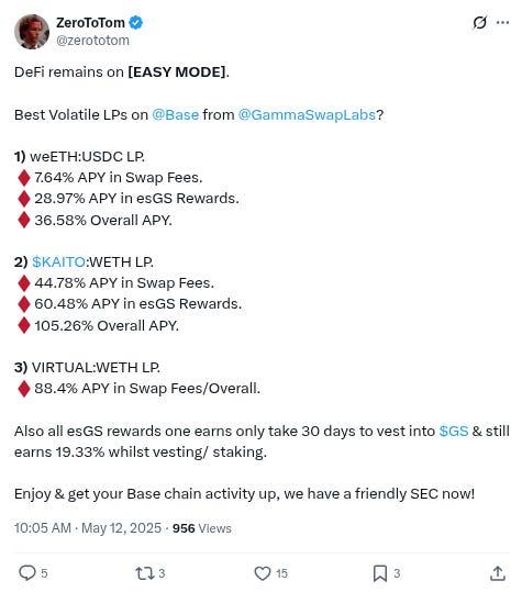 As detailed in the great tweet from @zerototom below, GammaSwap users are currently earning over 36% APY via ETH/USDC LP exposure, over 100% APY via KAITO/ETH LP exposure, and over 88% in VIRTUAL/ETH LP exposure!