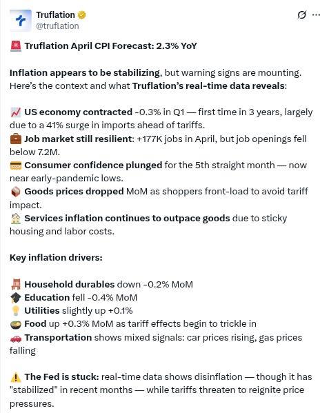-Most forecasts seem to be for 2.4% CPI (inflation) tomorrow, but @truflation is forecasting 2.3%: