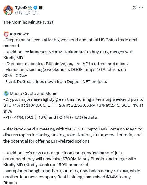 -JD Vance to speak at Bitcoin Vegas and Frank DeGods steps down from DeGods project, h/t morning news from @Tyler_Did_It: