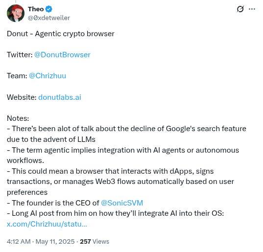 -New project called @DonutBrowser. Twitter bio states “The agentic crypto browser”. Followed by 5 of our mutuals. h/t @0xdetweiler: