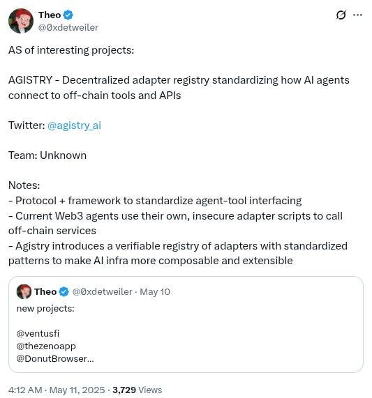 -New project called @agistry_ai. Twitter bio states “├ Decentralized adapter registry for AI agent-tool interfacing ├ Standardizing access to off-chain services & APIs”. Followed by 3 of our mutuals. h/t @0xdetweiler: