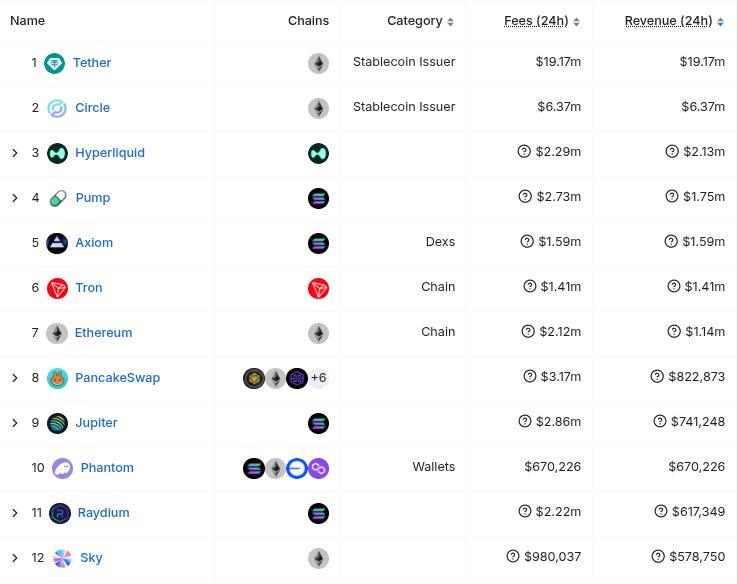 Here’s The Top Entities By 24 Hour Revenue Generation (from @DefiLlama):