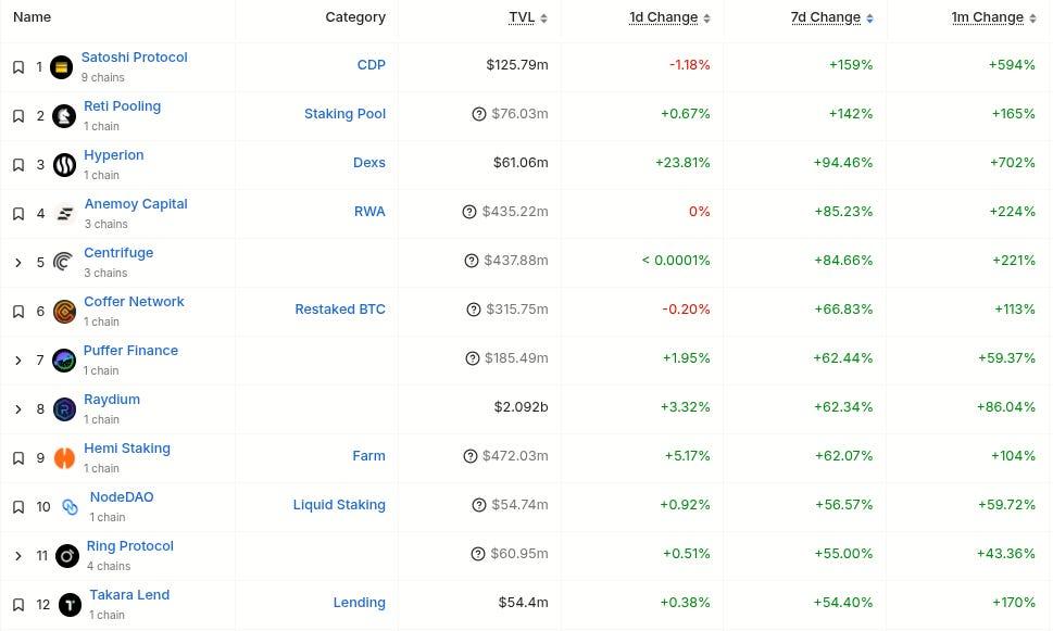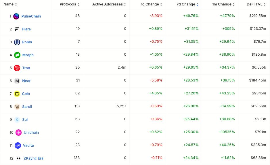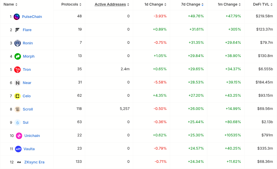 Here’s The Top 12 Best-Performing Chains By TVL On The Weekly With At Least $50M TVL: (from @DefiLlama):
