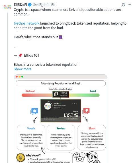-Seeing more and more talk about @ethos_network on the TL, which is a new SocialFi/tokenized-reputation project, example thread from @eli5_defi below: