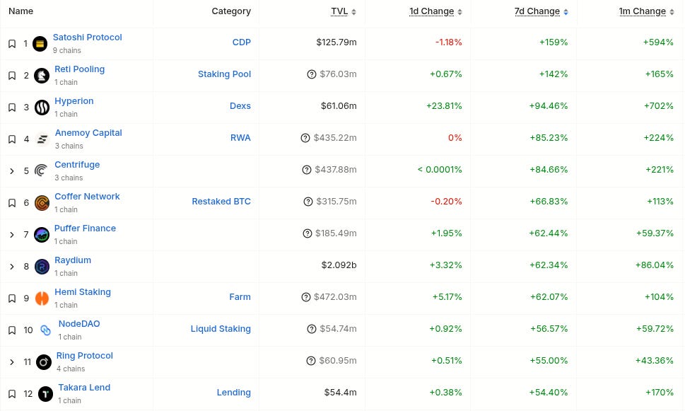 Here’s The Top 12 Best-Performing Protocols By TVL On The Weekly With At Least $50M TVL: (from @DefiLlama):
