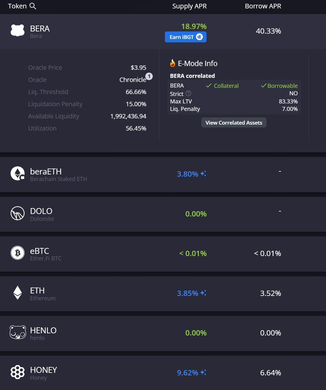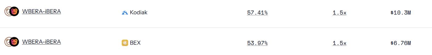 Building liquidity pools not only earns transaction fees but also generates significant interest income. For example, on DEXs like Kodiak and BEX, creating WBERA-iBERA pools yields over 50% annually. Moreover, participating on Infrared offers a 1.5x points multiplier. (https://infrared.finance/portfolio)