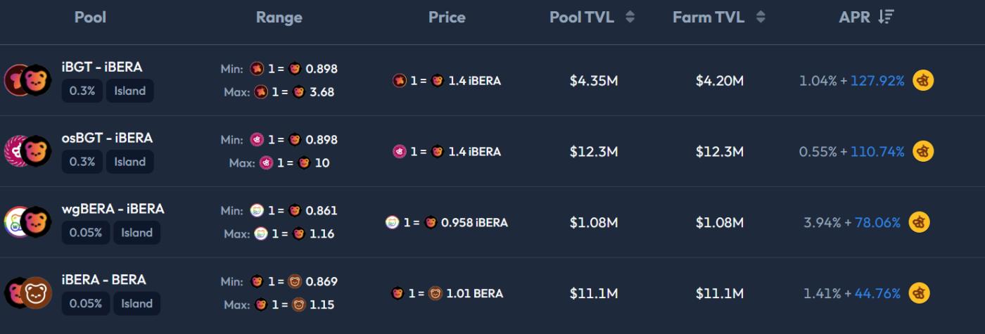 Users can earn significant returns through gradual liquidity pools, such as the iBGT-iBERA pool earning 1.04% in transaction fees and a 127.91% annual yield in HONEY. The iBERA-BERA pool has a 1.41% transaction fee yield, with a relatively lower HONEY yield of 44.76%.