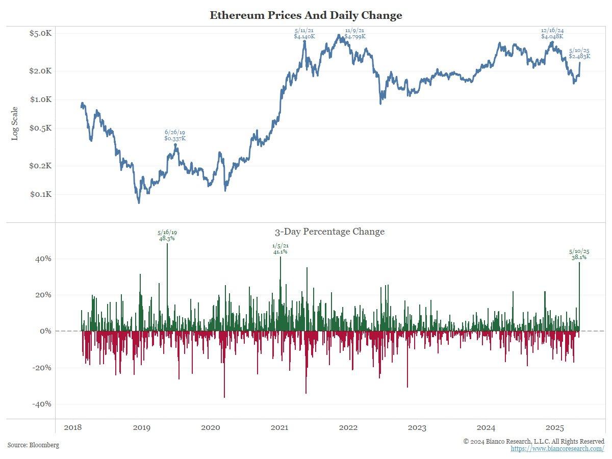 Jim Bianco from BiancoResearch noted that ETH surged 38% within just 72 hours. This marks the largest three-day gain since January 2021 and the second-largest in the past eight years.