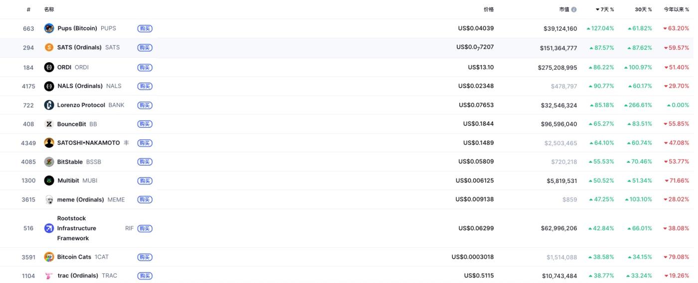 Over the past week, the Bitcoin ecosystem sector showed significant rebound signs. Top asset ORDI rose nearly 97% in six days, PUPS increased by 127.04%, becoming one of the strongest performers in this round of rebound; SATS rose 87.57%, nearly doubling from its yearly low; ORDI and NALS rose 86.22% and 90.77% respectively, with other assets like BANK, BB (BounceBit), and BSSB recording 40-80% weekly gains, with mainstream BRC-20 and Runes assets seeing recovery. Simultaneously, on-chain capital inflow became notably increased.
