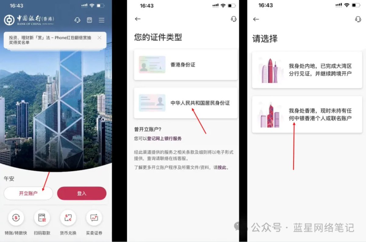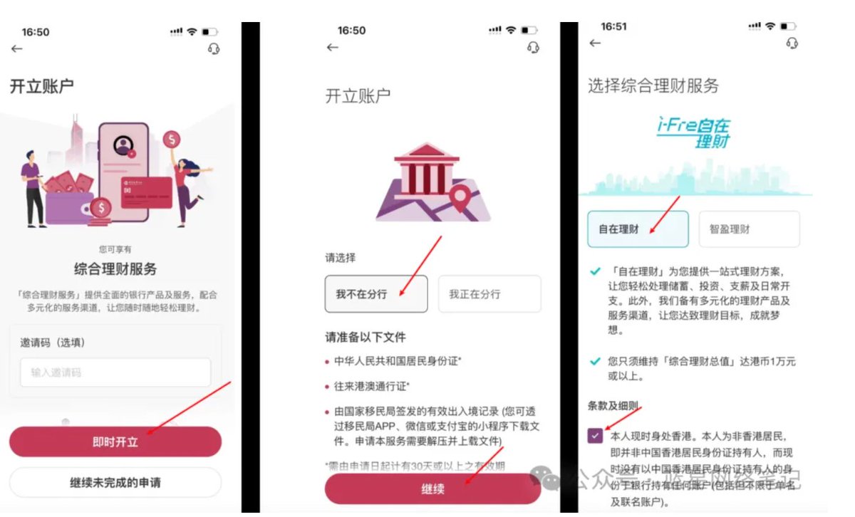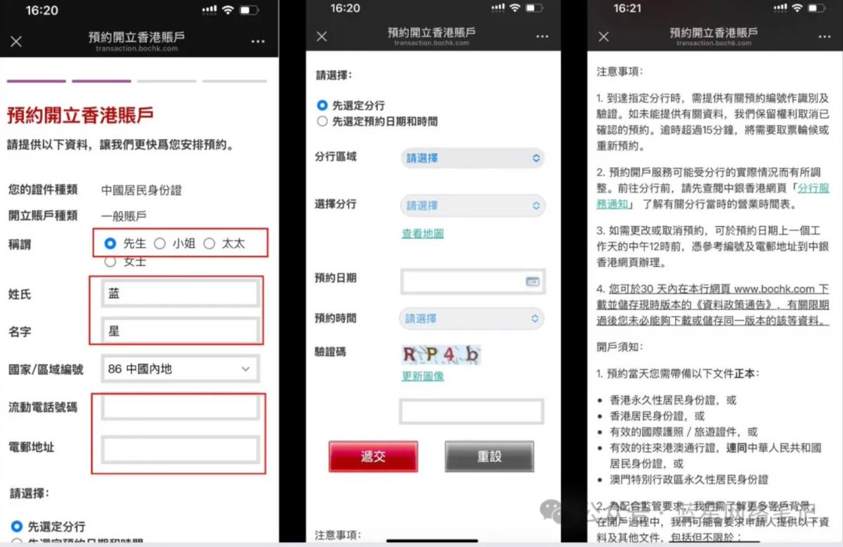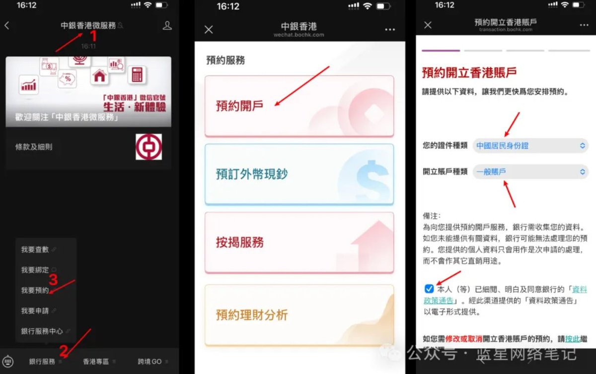 1) Follow [BOC Hong Kong Microservices] Official Account ——> Bottom Menu Bar ——> Banking Services ——> I want to make an appointment ——> Make an appointment for account opening ——> Select the type of certificate according to your own situation, and select [General Account] for account opening