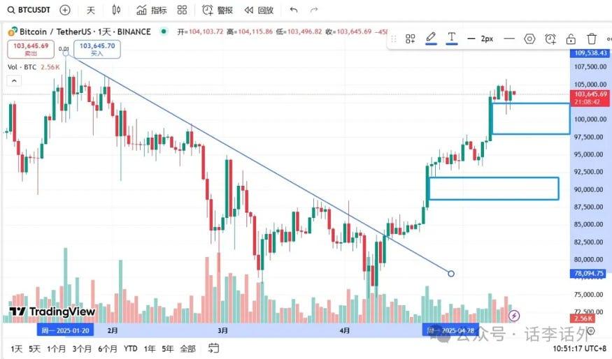 Continuing to look at the 4-hour level, the area around $98,000 is a position to watch. However, if it pulls back to this position, it will likely rebound again, and then the area around $93,000 may need to be filled. As shown in the following figure.