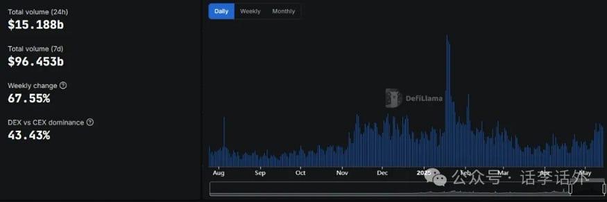 Or, we can judge market changes through trading volume changes between CEX and DEX, checking whether DEX trading volume has recently increased. An increase usually means strong current market demand and upward momentum, as shown in the following figure.