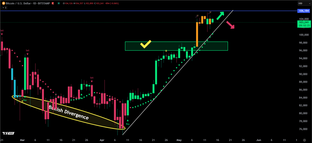Updated #Bitcoin daily chart. So far: • +42% bounce lasting 33 days • Price was getting overbought • RSI peaked at 77 The line in the sand has been drawn. Will we see price continue this upward trend or will the red arrow signal a retracement? twitter.com/JesseOlson/status/...