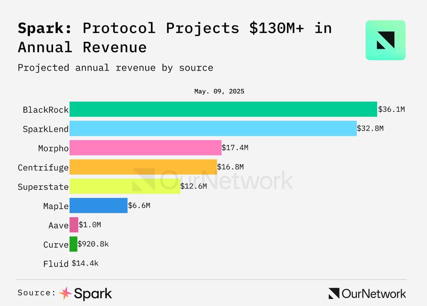 The Tokenization Grand Prix, and SLL more broadly, has been paying off so far. Spark is projected to generate over $130M for the protocol. Over 43% is projected to come from the three partners of the SLL. Spark's number one source of revenue is BlackRock, which is projected to generate $35.1M in the next 12 months.