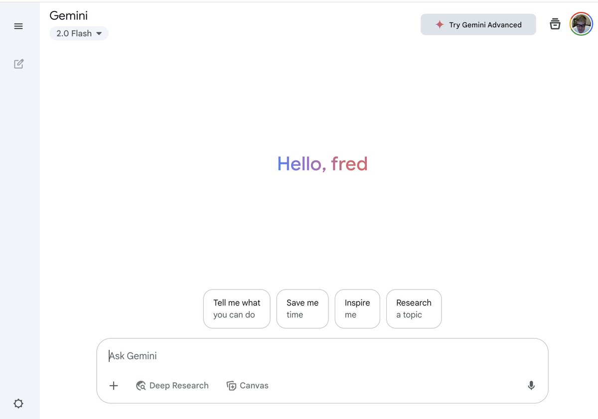 If you end up at http:/gemini.google.com -- you go to one of the most vacuous, poorly designed pages on the Internet. There is the rainbow "Hello <name>", the non-sensical "try advanced" (who wouldn't?) and the horrific non-buttons. 3/N
