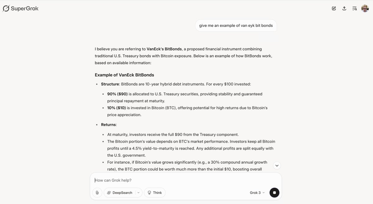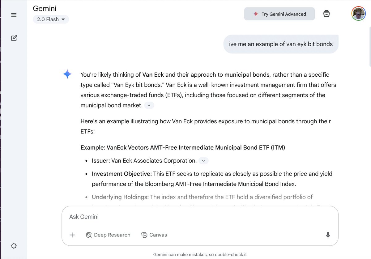 The results are awful. Here's a simple example. I am looking for Van Eyk "Bit Bonds" -- Grok clearly understands what I mean. Gemini does not have a clue